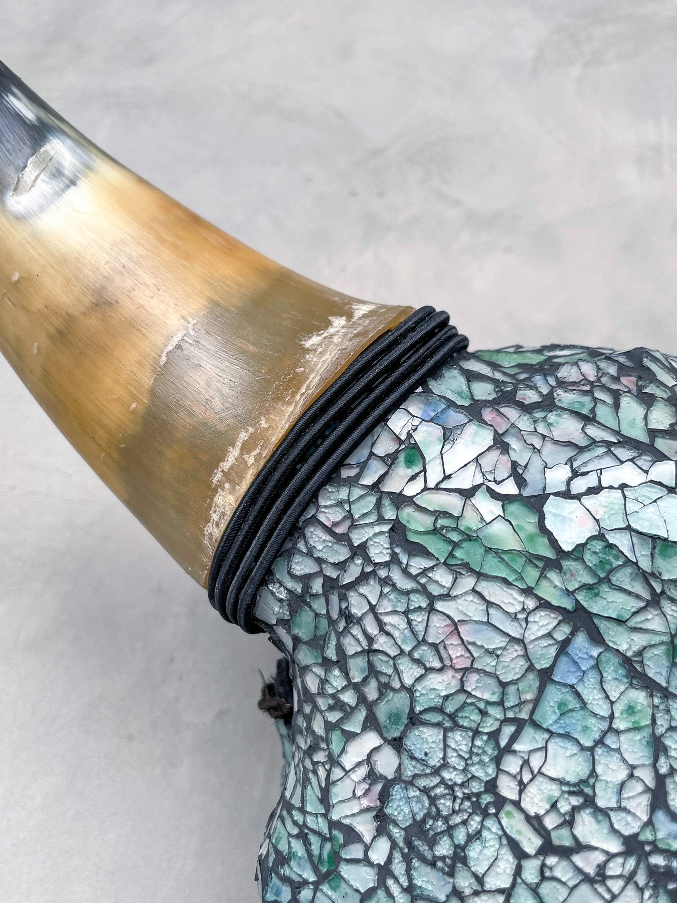 Transform your space with this hand-decorated glass mosaic cow skull, a breathtaking fusion of nature and artistry.